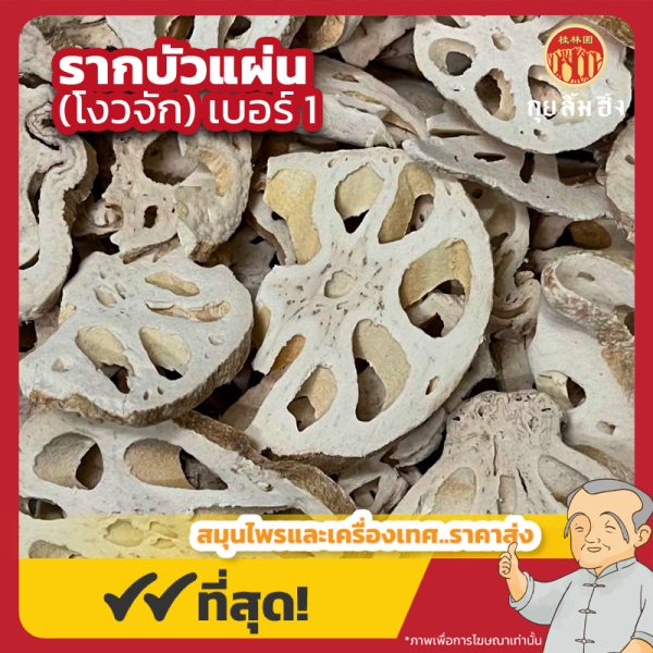รายละเอียด :รากบัว (藕) เป็นส่วนของลำต้นใต้ดินของบัวหลวง มีลักษณะเป็นปล้อง ๆ อวบน้ำ รูปร่างทรงกระบอก มีรูโพรงกลมขนาดเล็กเรียงตามแนวยาว ผิวภายนอกสีขาวอมชมพูหรือเทาน้ำตาลอ่อน เมื่อหั่นจะเห็นโพรงภายใน ภายในมีเนื้อแน่น สีขาวอมเหลือง มีรสหวานกรอบ