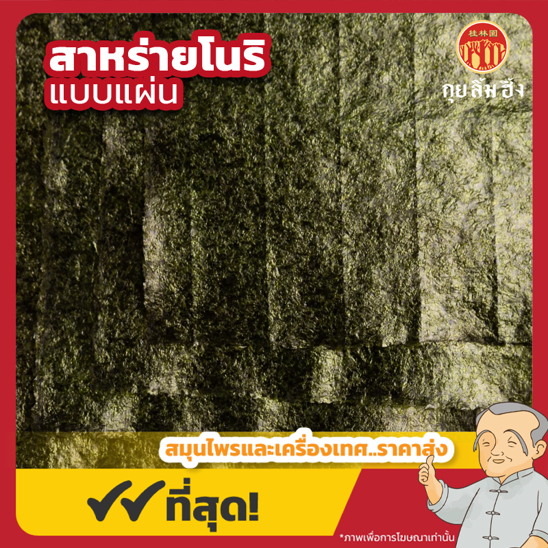 รายละเอียด : สาหร่ายโนริ (Nori) คือสาหร่ายทะเลสีเขียวเข้มที่ถูกแปรรูปเป็นแผ่นบาง ๆ และผ่านการคั่วแห้ง ชื่อวิทยาศาสตร์ โดยทั่วไปได้จาก Porphyra spp. (เช่น Porphyra yezoensis) ลักษณะ แผ่นบาง สีเขียวเข้มถึงดำ ผิวเรียบแห้ง บางรุ่นมีความมันเล็กน้อยเพราะผ่านการอบหรือน้ำมัน รสชาติเค็มเล็กน้อย มีกลิ่นหอม รสอูมามิจากธรรมชาติ