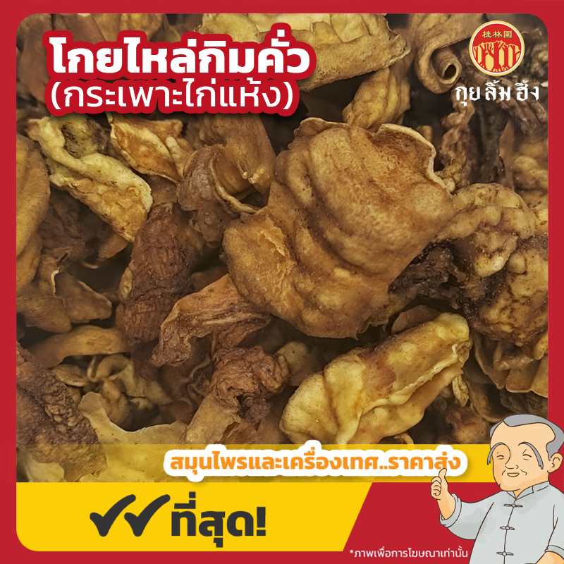 รายละเอียด : โกยไหล่กิม (ภาษาจีน: 鸡内金, Ji Nei Jin) แปลตรงตัวว่า “ทองในท้องไก่” หรือที่คนไทยรู้จักกันในชื่อว่า กระเพาะไก่แห้ง คือเยื่อบาง ๆ ที่อยู่ด้านในของกระเพาะอาหารไก่ ซึ่งเมื่อนำมาทำให้แห้งและผ่านกระบวนการทำความสะอาดแล้ว ลักษณะเป็นแผ่นบาง สีเหลืองทองอมน้ำตาล มีกลิ่นเฉพาะของโปรตีนอบแห้ง และรสมันเล็กน้อย